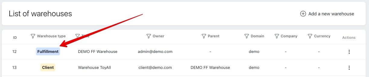Each client warehouse is linked to the fulfillment warehouse (there is a “parent” field). In fact, all the goods are in the main (fulfillment) warehouse. And all the work is done there. The client warehouses are actually a virtual add-on, so that the system can distinguish the goods of different clients in one warehouse.